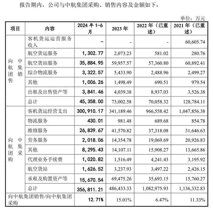 说明书显示,2023年和2024年上半年,国货航向中航集团销售额分别为7.3亿元和4.54亿元,向中航集团采购额分别为48.64亿元和35.68亿元。