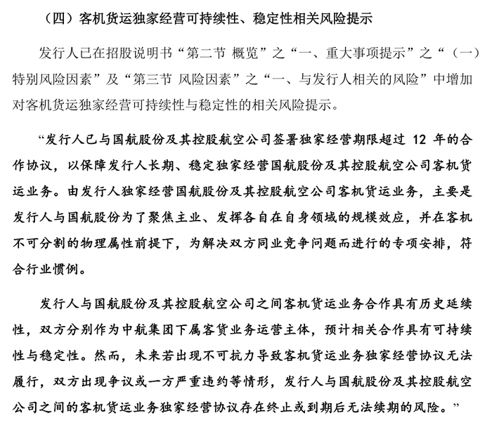 然而国货航强调,未来若出现不可抗力导致客机货运业独家经营协议无法履行,双方出现争议或一方严重违约等情形,发行人与国航股份及其控股航空公司之间的客机货运业务独家经营协议存在终止或到期后无法续期的风险。