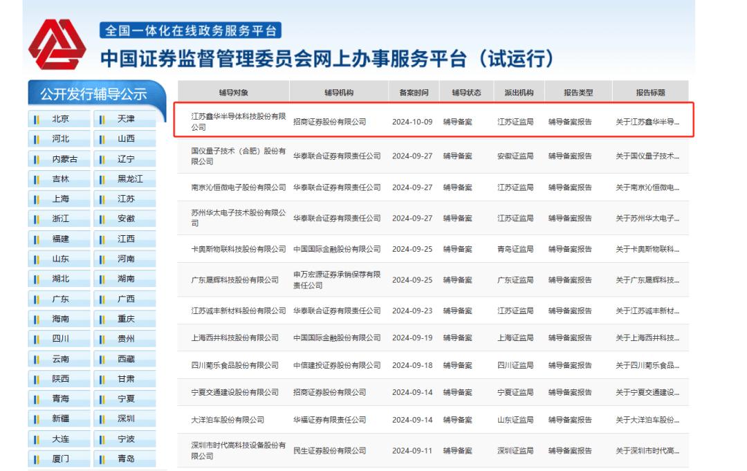 证监会网站显示,10月9日,江苏鑫华半导体科技股份有限公司(以下简称鑫华半导体)在江苏证监局进行上市辅导备案,辅导机构为招商证券。这意味着鑫华半导体正式启动IPO进程。