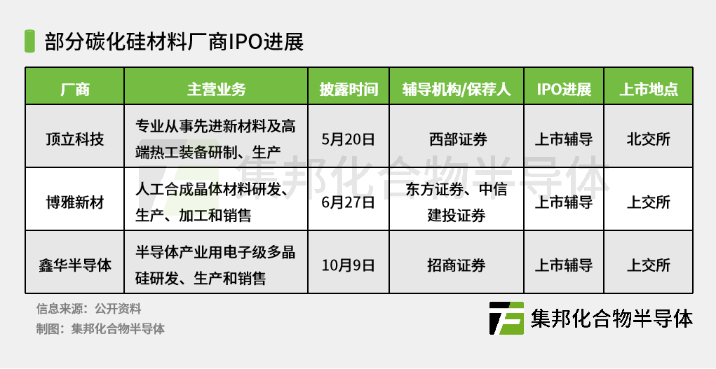 博雅新材则于6月27日与东方证券、中信建投证券签署了上市辅导协议。博雅新材在2016年成立之后,主营业务和碳化硅并无太大关联性,但在近年来在碳化硅产业蓬勃发展的大趋势下,博雅新材开始跨界布局碳化硅。尤其是在2022年8月,博雅新材完成逾4亿元D轮融资后,开始加强对碳化硅等第三代半导体材料的生产投入。