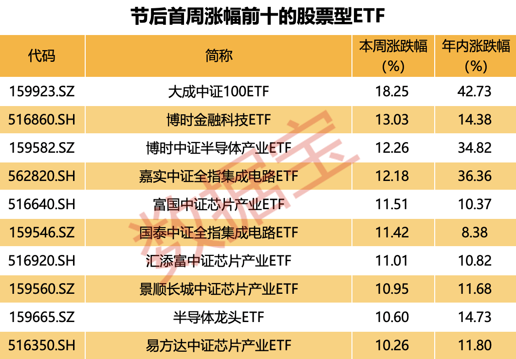 据证券时报·数据宝统计,本周有110多只股票型ETF录得上涨,12只ETF涨幅超10%,主要集中在半导体、金融科技基金。