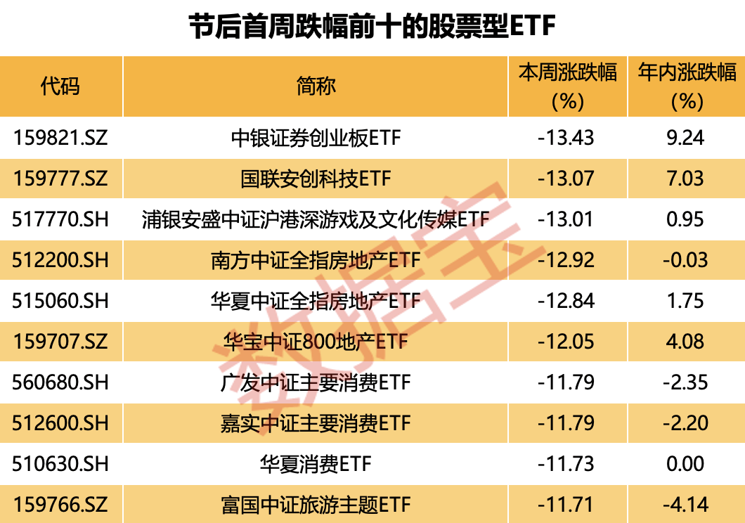 本周跌幅前十的股票型ETF中,有多只房地产和消费ETF。其中,南方中证全指房地产ETF跌幅接近13%。