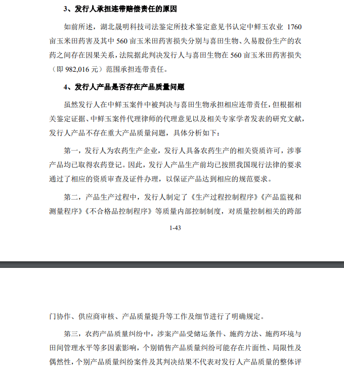 久易股份回复称,报告期内,以公司为被告的诉讼、仲裁案件合计10个,案件标的合计1164.14万元。其中,在中鲜玉农业诉发行人及喜田生物产品生产者责任纠纷案(以下简称“中鲜玉案件”)中,法院判决认为,根据法律规定产品责任的构成要件包括产品存在缺陷,有损害事实,产品缺陷与损害事实之间存在因果联系。法院判决喜田生物赔偿原告中鲜玉农业损失3,086,336元,发行人在损失982,016元范围内与被告喜田生物承担连带清偿责任;喜田生物与发行人连带给付原告中鲜玉农业鉴定费4万元。