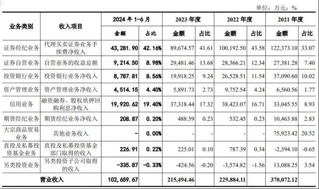 招股书中显示,2021年至2024年上半年,东莞证券的证券经纪业务营收占比从33.07%提升至42.16%,信用业务从8.93%增长至19.4%,证券自营、投资银行业务的营收占比在10%左右,其他的业务营收占比相对较低。