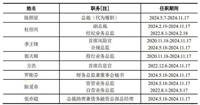 从时间来看,总裁、副总裁兼经纪业务总监、首席风险官兼合规总监、投行业务总监、首席信息官等今年5月新上任在内的高管,履职均截止于今年11月中旬。
