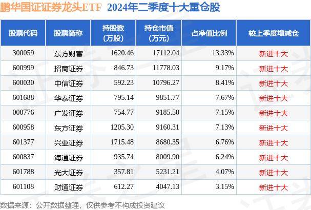 鹏华国证证券龙头ETF为指数型-股票基金,根据最新一期基金季报显示,该基金资产配置:股票占净值比97.79%,无债券类资产,现金占净值比2.23%。基金十大重仓股如下: