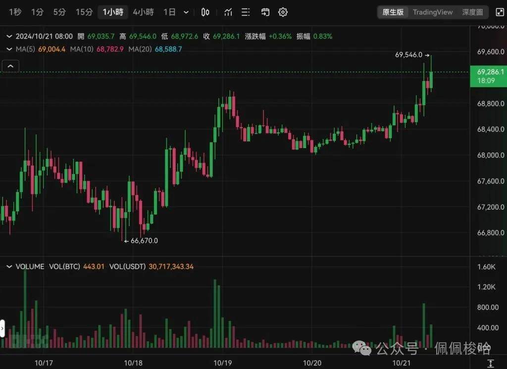 比特币在刚结束的周末持续在68,000 美元上方震荡,直到今(21)晨六点后再次发力,一举突破6.9 万美元关卡,撰稿前最高来到69,546 美元,距离七月底短暂突破的7万美元只剩一步之差。
