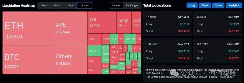 比特币上涨的行情中,据Coinglass数据显示,过去24 小时,加密货币全网爆仓金额超过1.33 亿美元,有近5.6 万人遭清算。