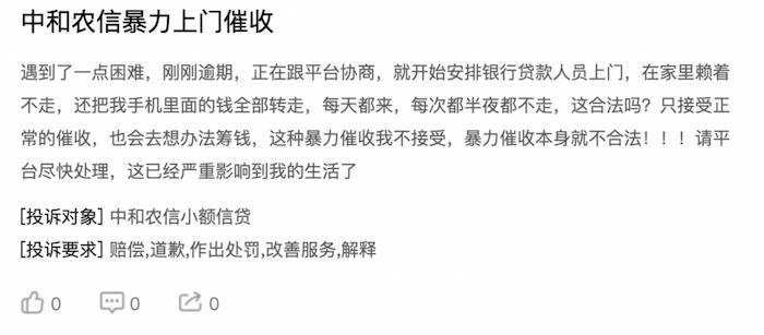 在催收方面,值得注意的是,中和农信并未采用第三方团队进行催收。然而,黑猫投诉网上仍存在一些关于公司暴力催收的投诉。