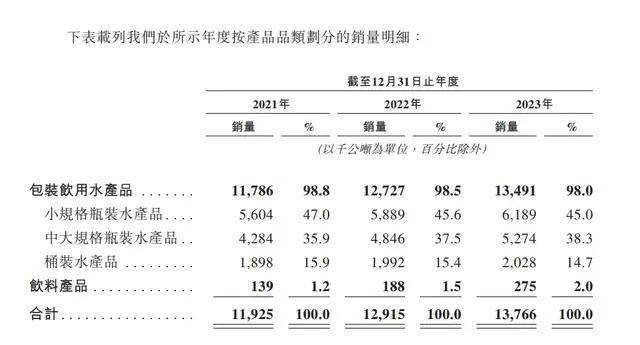 “卖水”也为华润饮料贡献了超9成的收入,《招股书》显示,2021年至2023年,华润饮料来自于包装饮用水产品的收入分别为108.18亿元、119.06亿元、124.47亿元。按单瓶容量看,方便携带的小规格瓶装水产品(不超过1升)带来的收入,占总营收的比例均达45%以上。
