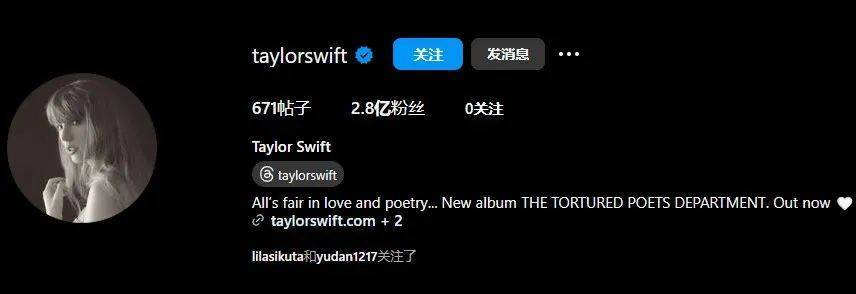 澎湃明查在10月25日对斯威夫特各个社交平台主页的粉丝量进行了查询,结果显示,斯威夫特在Instagram上拥有2.8亿粉丝,在TikTok上拥有3290万粉丝,在X上拥有9497万粉丝。相较之前的粉丝量,并未发现明显下降。