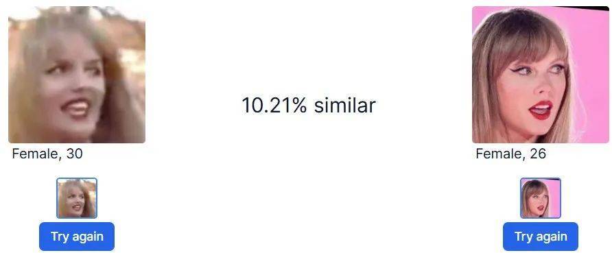 使用Faceshape对视频中的歌手与斯威夫特本人的照片进行多次对比,最高相似度只有10.21%,匹配度极低,此外,视频中的歌手与斯威夫特的面部和身材特征均存在明显差异。