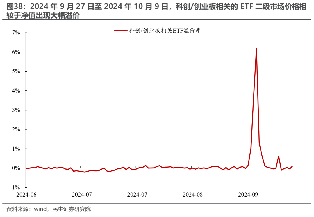 值得关注的是,从边际上看,个人ETF自10月11日以来开始被持续净赎回,相应地,而在2024年9月27日至2024年10月9日期间,科创/创业板相关的ETF交易形成的大幅溢价快速收窄。从这一点看,新增个人投资者可能经历了从“害怕错过上涨”到“害怕失去收益”的过程,而对于存量个人参与者而言,正如我们前面测算的,“回本赎回”可能是当下的主要行为,这也是当下市场交易层面的主要扰动之一。此外,考虑到被动偏股基金持有A股的规模在2024Q3首次超越了主动基金,而在本轮行情中个人投资者也大量参与到ETF的二级交易当中,ETF崛起将是改变未来市场微观定价机制的重要变量之一,如:一揽子交易可能会提高择时的必要性,一二级定价偏离带来的套利空间可能影响成分股的定价等。