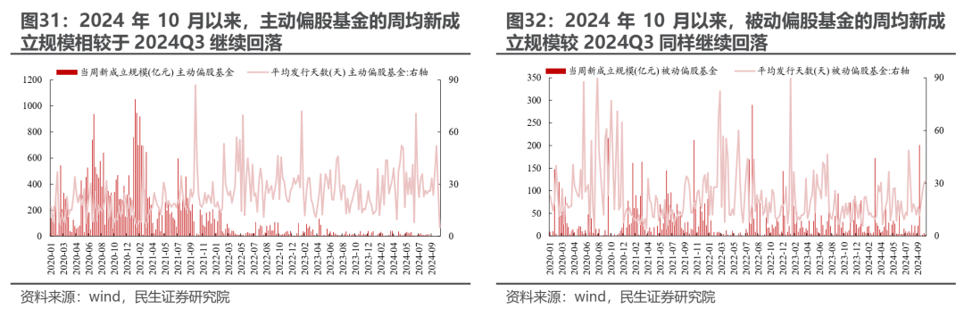 1)对于主动偏股基金, 2024Q3其新成立规模明显回落,存量部分继续被明显净赎回且赎回规模环比回升。整体而言,主动偏股基金的负债端(新发+净申购)遭遇的净流出规模从2024Q2的723.31亿元回升至2024Q3的1093.51亿元,净流出规模低于2024Q1与2023Q4水平。值得一提的是,主动偏股基金的负债端(新发+净申购)已经连续6个季度遭遇资金净流出。