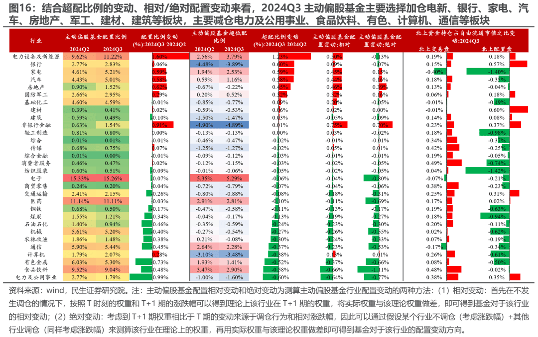 2.32024Q3的配置方向:新能源产业链、银行、家电、地产链、军工等板块,资源、公用事业等板块被不同程度减配