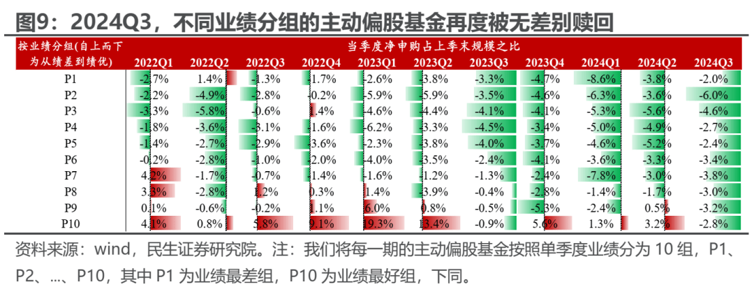 此外,按照业绩排名划分主动偏股基金来看,整体而言,2024Q3不同业绩分组的主动偏股基金再度被无差别赎回,如果结合2024Q2业绩同时来看,仅2024Q2业绩较好+2024Q3业绩不垫底的基金才可能被净申购,这意味着阶段而言,连续业绩不佳、或者此前表现不佳但2024Q3净值反弹的基金的负债端可能遭遇了明显的赎回,而此前业绩较好的基金在2024Q3反而可能被净申购。