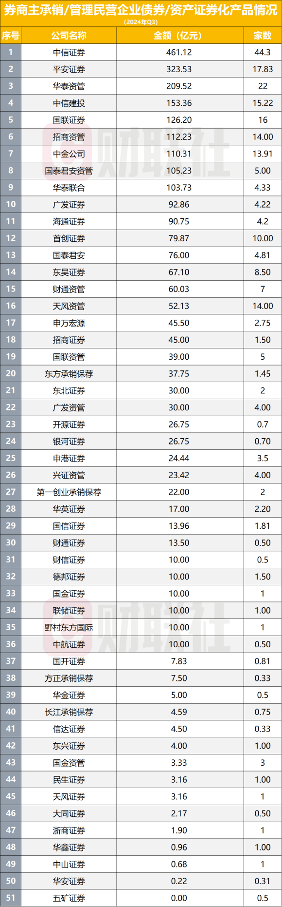在民营企业公司债券承销家数方面,中信证券的民营企业公司债承销家数为44.3家,遥遥领先于其他券商。华泰资管的承销家数为22家,位列行业第二。承销家数超过15家的券商还有平安证券(17.83家)、国联证券(16家)、中信建投证券(15.22家)。