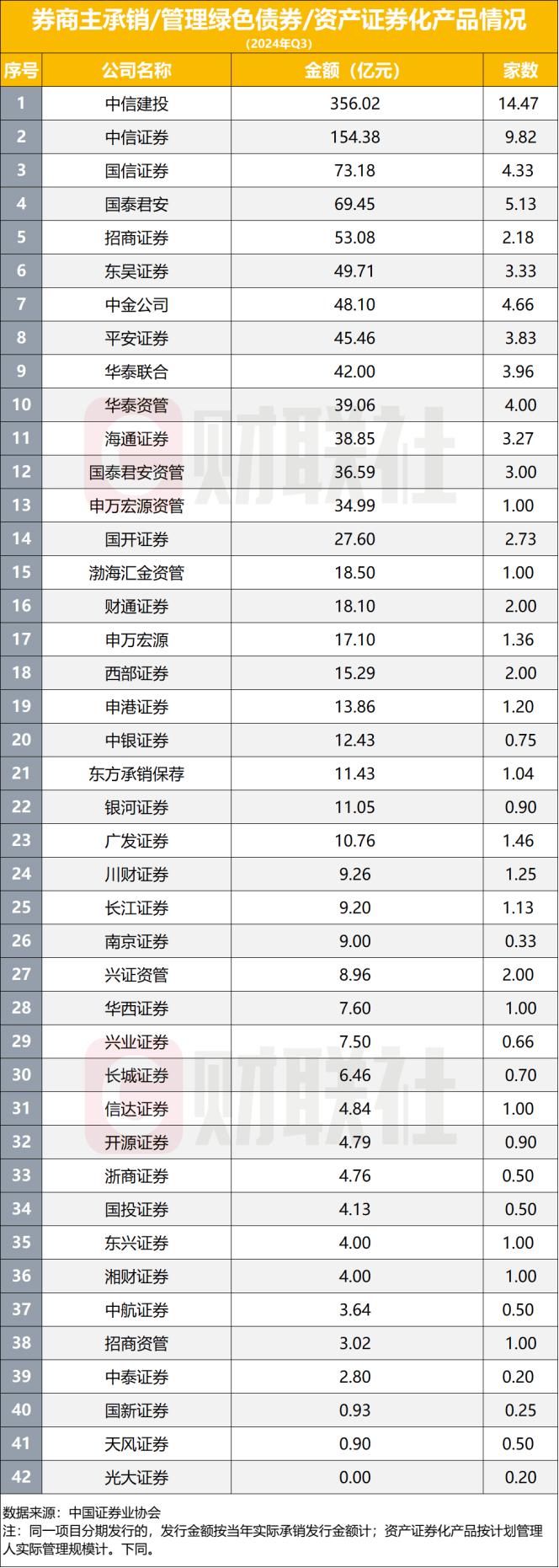 根据中证协数据,2024年前三季度,作为绿色债券主承销的券商共42家,承销(或管理)102只债券(或产品),合计金额1292.77亿元。尽管与去年同期相比承销数量上与去年同期相比下滑了20.93%,但发债规模仍在持续上升。其中,承销规模排名前五的券商占总规模比54.62%。