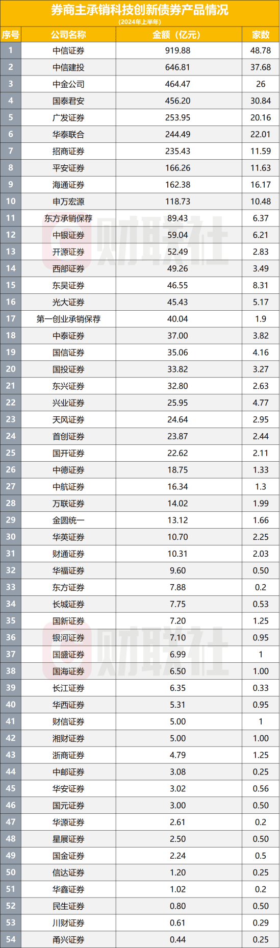 在承销规模方面,排名前十的券商主承销科技创新公司债券的规模都超过了100亿元。分别是中信证券(919.88亿元)、中信建投证券(646.81亿元)、中金公司(464.47亿元)、国泰君安证券(456.20亿元)、广发证券(253.95亿元)、华泰联合证券(244.49亿元)、招商证券(235.43亿元)、平安证券(166.26亿元)、海通证券(162.38亿元)以及申万宏源证券(118.73亿元)。