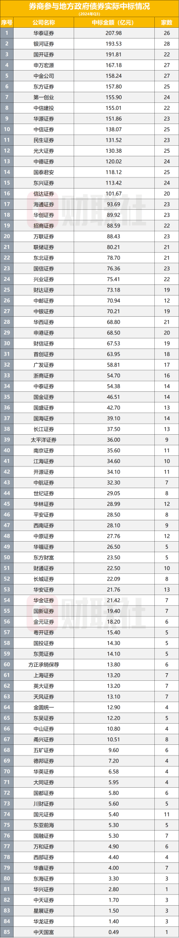 华泰证券和银河证券在参与地方政府债发行中,分别以207.98亿元、193.53亿元的中标金额,居行业一、二名。地方政府债券实际中标金额超过100亿元的券商高达16家。