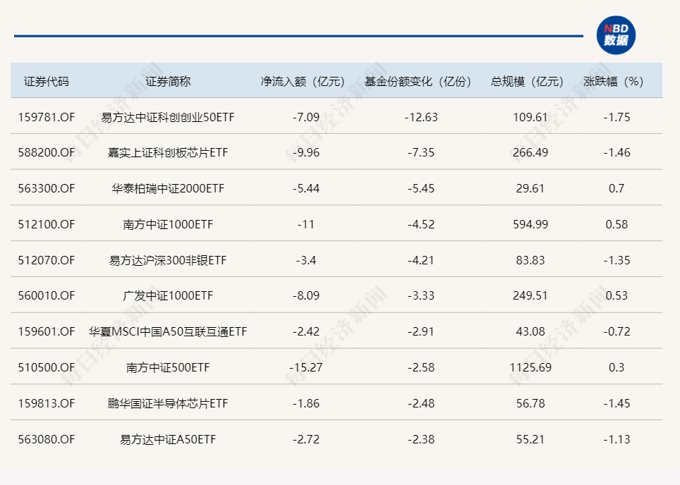 与此同时,易方达中证科创创业50ETF的基金份额减少了12.63亿份,净流出7.09亿元;嘉实上证科创板芯片ETF的基金份额减少了7.35亿份,净流出9.96亿元;华泰柏瑞中证2000ETF的基金份额减少了5.45亿份,净流出5.44亿元。