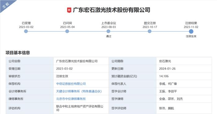 界面新闻了解到,该公司IPO申请于2023年3月2日受理,5月4日被问询,8月3日通过上市委会议审议,2023年11月2日注册生效。