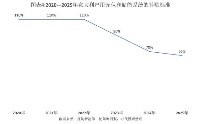 然而,2023—2025年,意大利户用光伏和储能系统的补贴标准将分别降至90%、70%、65%,补贴出现明显“退坡”。