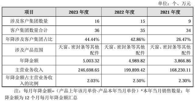 2021年、2022年和2023年,毓恬冠佳和主要客户虽然都存在年降执行情况,但年降金额占其主营业务收入的比例仅为2.30%、2.50%和2.03%,且该公司正积极与整车厂进行价格谈判,并不会对其业绩产生较大不利影响。