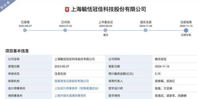 11月14日,上海毓恬冠佳科技股份有限公司(下称“毓恬冠佳”)在深圳证券交易所的上市审核状态变更为“注册生效”。与之对应的是,证监会于11月13日批复同意该公司首次公开发行股票的注册申请。