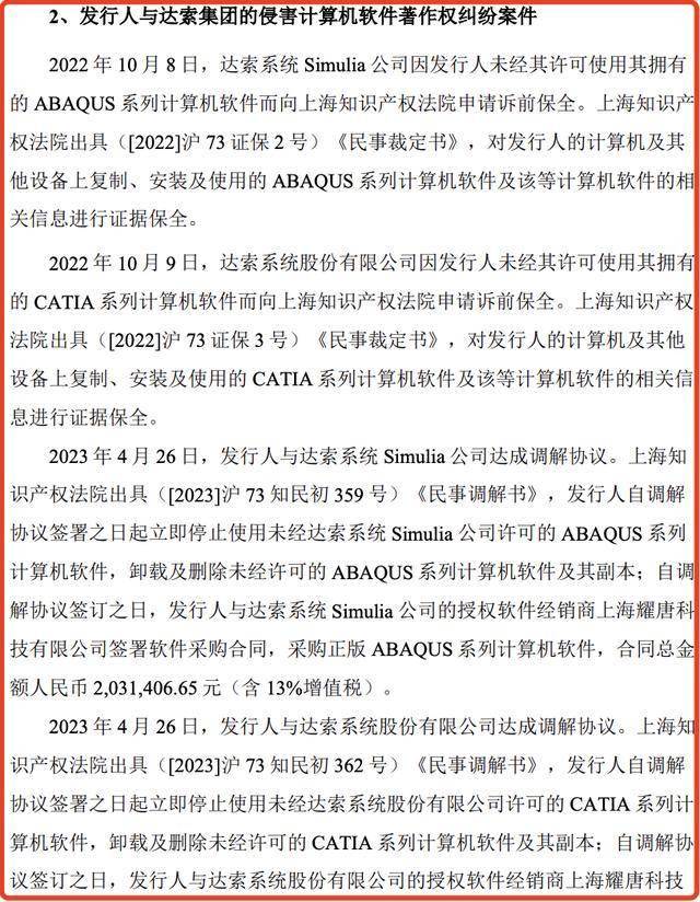 不过,毓恬冠佳曾多次卷入著作权纠纷案件,曾于2022年因未经其许可使用侵权计算机软件而与达索系统Simulia公司产生纠纷。其中,因ABAQUS和CATIA系列软件相关纠纷而于2023年4月与之和解,并支付采购费用约1499万元。