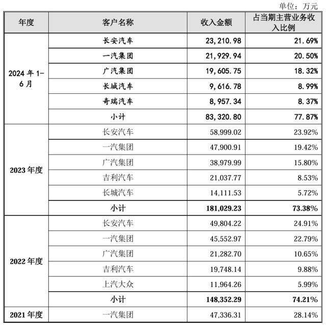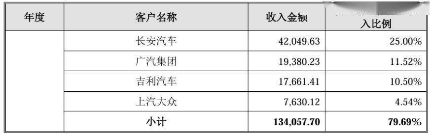 贝多财经发现,毓恬冠佳的客户集中度较高。报告期内,该公司来自前五大客户的收入分别占其主营业务收入的79.69%、74.21%、73.38%和77.87%,其中长安、一汽的收入占比均超20%,来自广汽的收入金额也逐年攀升。