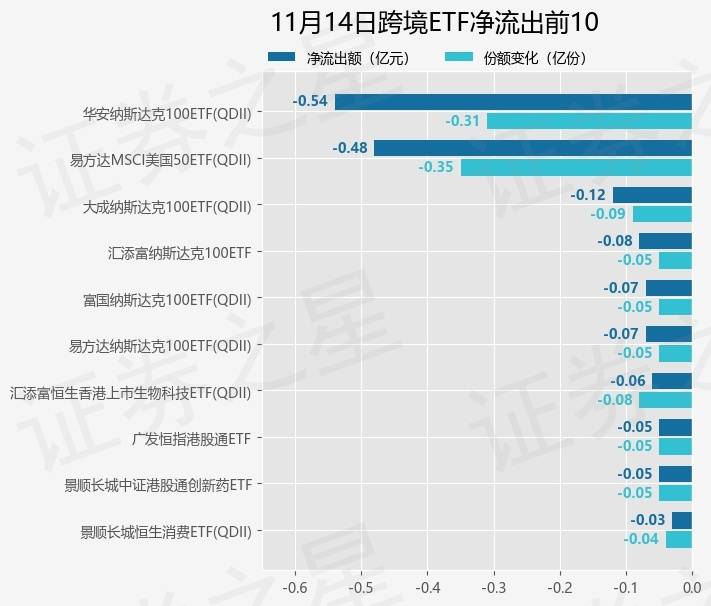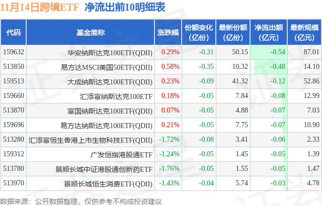 当日有17只跨境ETF基金出现资金净流出,其中净流出排首位的是华安纳斯达克100ETF(QDII)(159632),份额减少了3100.0万份,净流出额为5397.22万元。