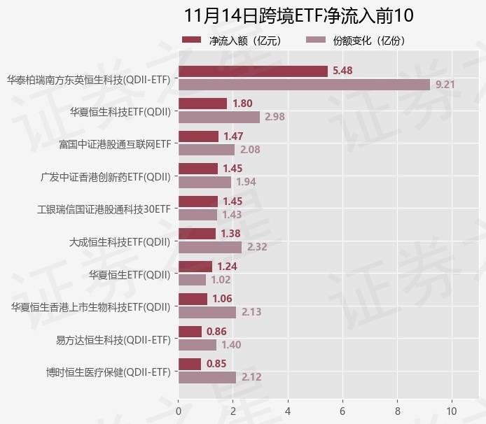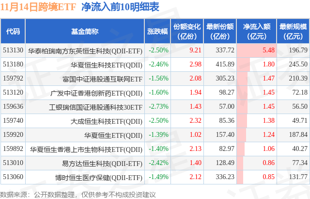 当日有58只跨境ETF基金出现资金净流入,其中净流入排首位的是华泰柏瑞南方东英恒生科技(QDII-ETF)(513130),份额增加了9.21亿份,净流入额为5.48亿元。
