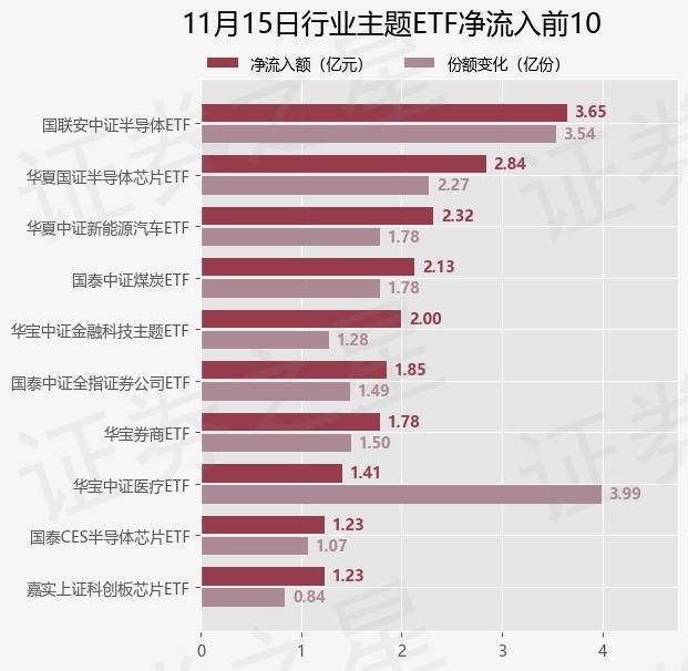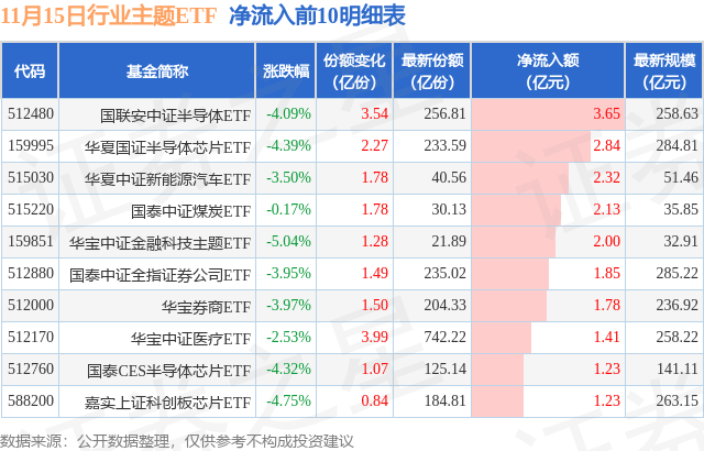 当日有152只行业主题ETF基金出现资金净流入,其中净流入排首位的是国联安中证半导体ETF(512480),份额增加了3.54亿份,净流入额为3.65亿元。