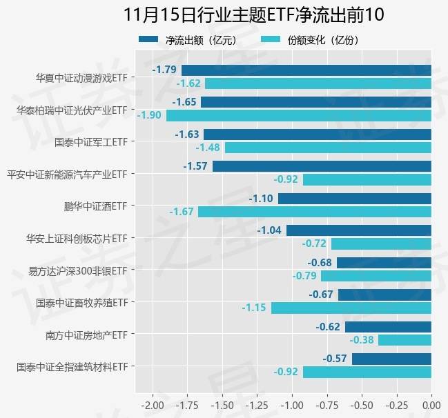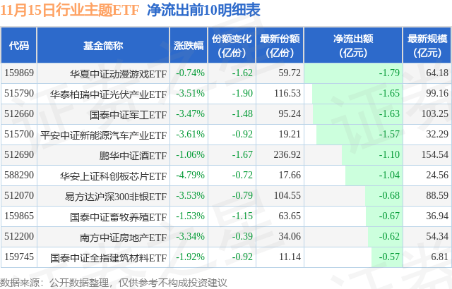 当日有134只行业主题ETF基金出现资金净流出,其中净流出排首位的是华夏中证动漫游戏ETF(159869),份额减少了1.62亿份,净流出额为1.79亿元。
