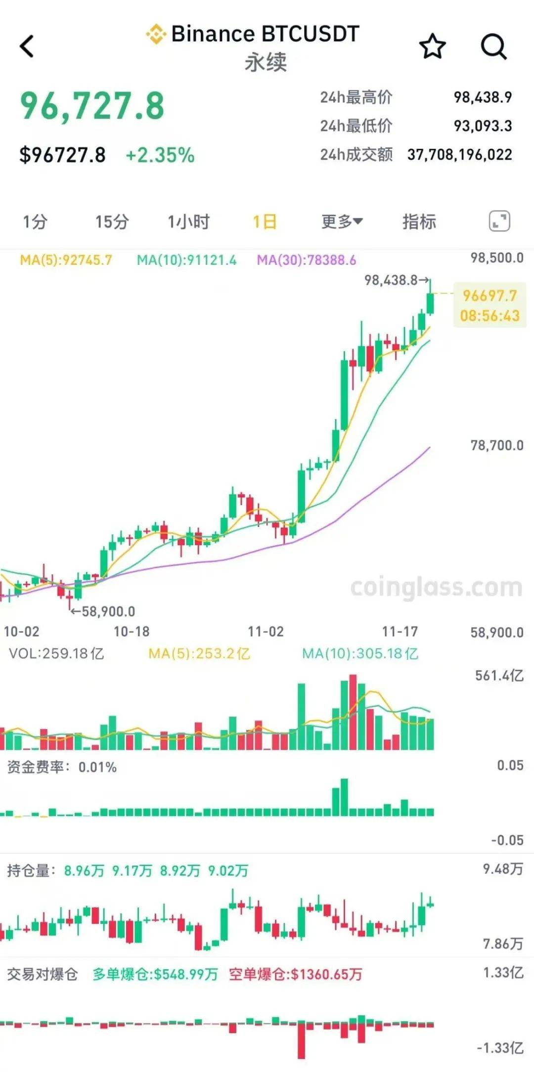 北京时间11月21日,比特币涨势迅猛,接连突破95000美元、96000美元、97000美元、98000美元关口,最高涨至98438.9美元。截至记者发稿时,比特币价格跌破97000美元。