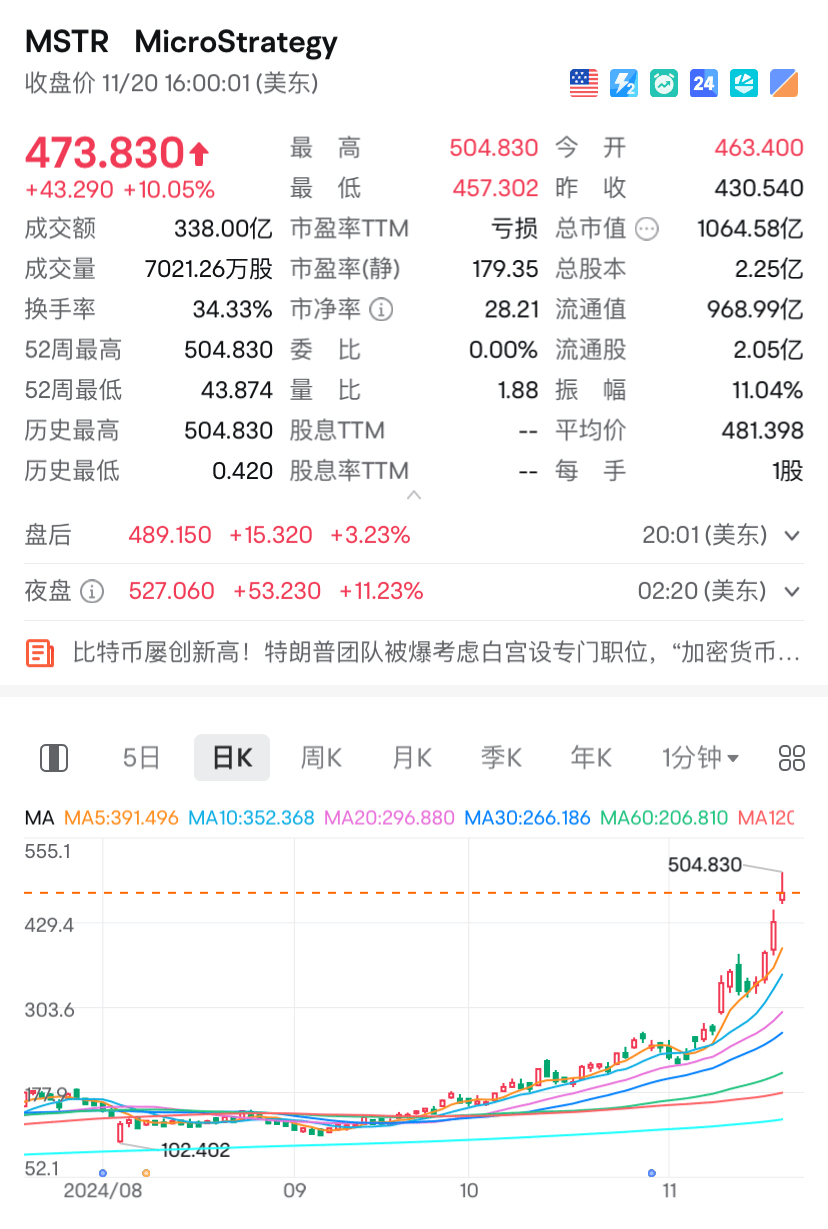 美股市场中,比特币概念股表现同样突出。当地时间周三收盘,MicroStrategy上涨10.05%,总市值首次突破1000亿美元。今年以来,该股已经上涨超过650%。