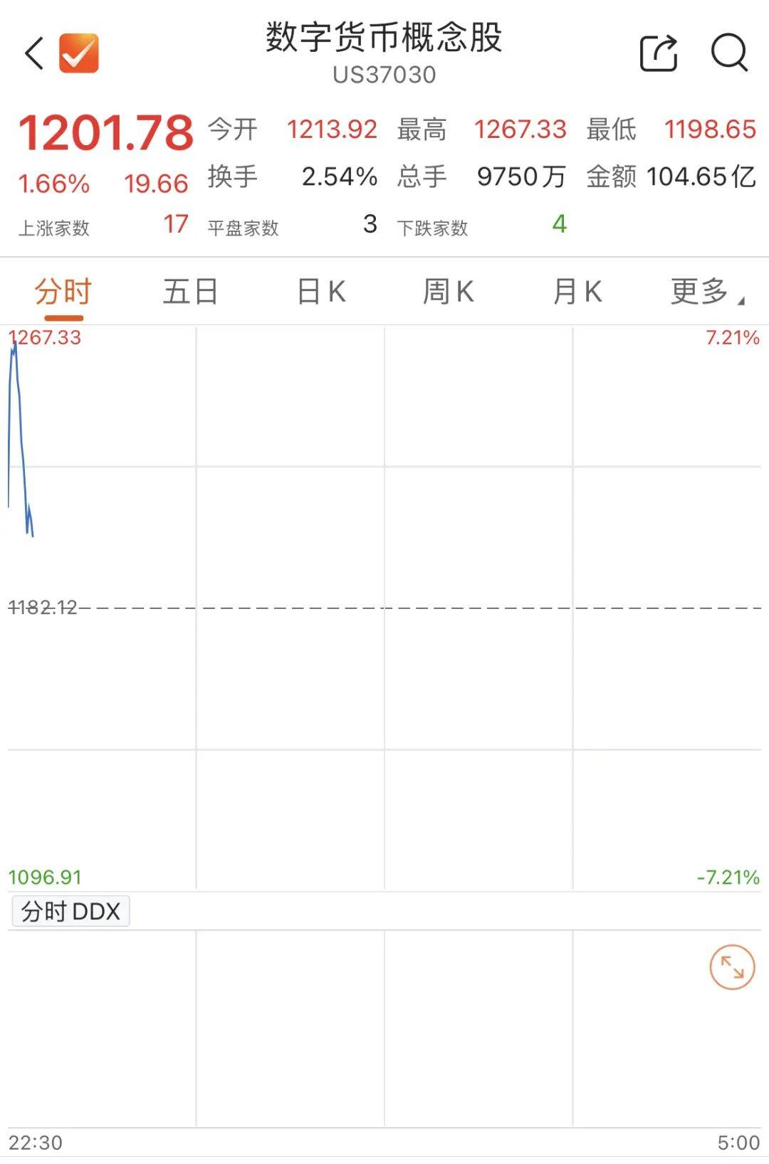 美股开盘,数字货币概念股迅猛拉升,截至发稿有所回落,涨1.66%。