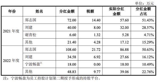 2021至2022年,郑志国过员工持股平台畅运同赢分别取得分红金额168.91万元、108.60万元,扣除税费后,郑志国分别实际取得分红金额57.60万元、86.88万元,合计为144.48万元。