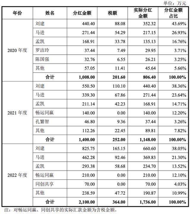 扣除税费后,刘建实际分别直接取得分红金额352.32万元、440.40万元和660.60万元。2021至2022年,刘建通过员工持股平台畅运同赢分别取得分红40.00万元、34.58万元,扣税后实际取得32.00万元、27.66万元。