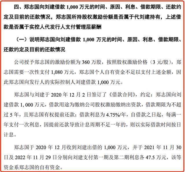 就此,深圳证券交易所曾要求天助畅运说明郑志国向刘建借款1000万元的时间、原因、利息、借款期限、还款约定及目前的还款情况,郑志国所持股权激励份额是否属于代刘建持有,上述借款是否属于实控人代发行人(即“天助畅运”)支付管理层薪酬等。