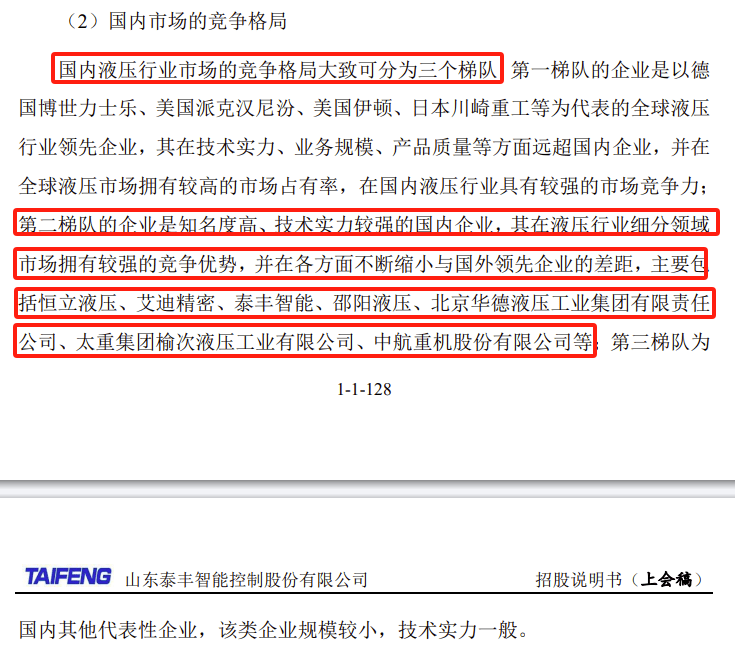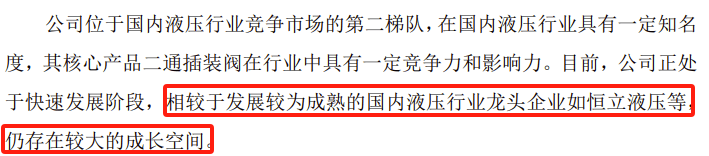 招股书“国内市场的竞争格局”中又称自己属于第二梯队,相较于发展较为成熟的国内液压行业龙头企业如恒立液压等,仍存在较大的成长空间。仍存在较大的成长空间,实际意思就是目前仍有较大差距。