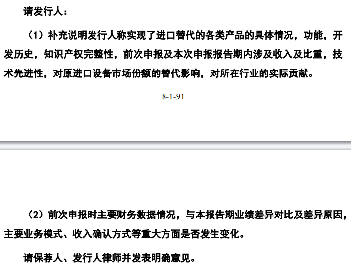 公司2022年8月申报创业板IPO时,保荐机构已变更为第一创业证券。首轮问询“问题3.关于前次申报“要求发行人:(1)补充说明发行人称实现了进口替代的各类产品的具体情况,功能,开发历史,知识产权完整性,前次申报及本次申报报告期内涉及收入及比重,技术先进性,对原进口设备市场份额的替代影响,对所在行业的实际贡献。(2)前次申报时主要财务数据情况,与本报告期业绩差异对比及差异原因,主要业务模式、收入确认方式等重大方面是否发生变化。