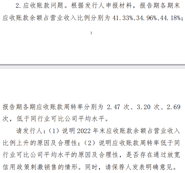 2.应收账款问题。根据发行人申报材料,报告期各期末应收账款余额占营业收入比例分别为 41.33%、34.96%、44.18%;报告期各期应收账款周转率分别为 2.47 次、3.20 次、2.69次,低于同行业可比公司平均水平。
