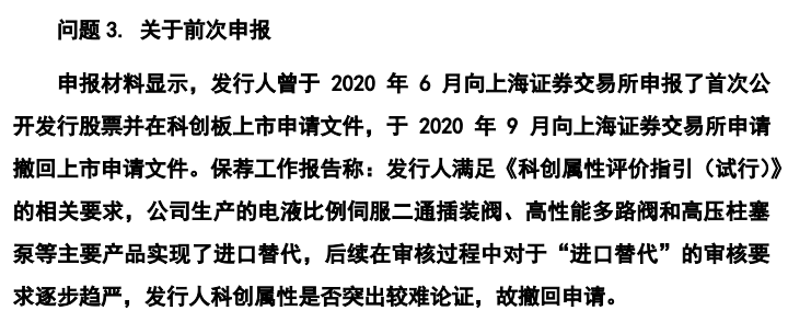 公司曾于2020年6月申报科创板IPO,当时保荐机构为长城国瑞证券。于2020年9月向上交所申请撤回上市申请文件。保荐工作报告称:发行人满足《科创属性评价指引(试行)》的相关要求,公司生产的电液比例伺服二通插装阀、高性能多路阀和高压柱塞泵等主要产品实现了进口替代,后续在审核过程中对于“进口替代”的审核要求逐步趋严,发行人科创属性是否突出较难论证,故撤回申请。