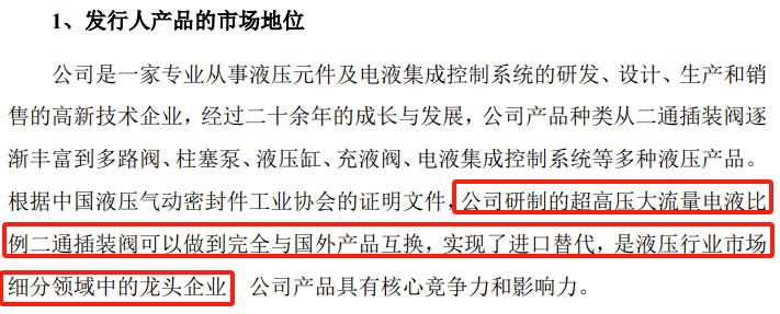 公司招股说明书(申报稿)自称:公司研制的超高压大流量电液比例二通插装阀可以做到完全与国外产品互换,实现了进口替代,是液压行业市场细分领域中的龙头企业,公司产品具有核心竞争力和影响力。