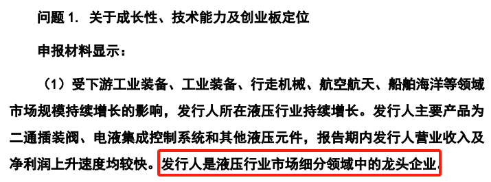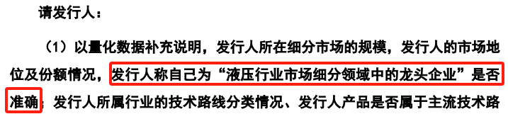 对于公司在招股书中称自己为“液压行业市场细分领域中的龙头企业“。审核中心在问询函中要求公司:以量化数据补充说明,发行人所在细分市场的规模,发行人的市场地位及份额情况,发行人称自己为“液压行业市场细分领域中的龙头企业”是否准确。