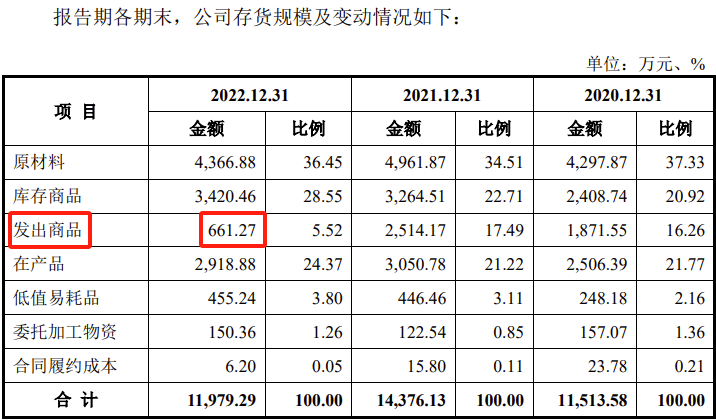2020年末、2021年末,公司存货中的发出商品金额分别为1872万元、2514万元。但2022年末,发出商品金额只有661万元,大幅下降。招股书披露:发出商品较上年末减少1852.90 万元主要系 2022 年底受外部环境影响,发行人 2022 年底的发货量有所减少所致。