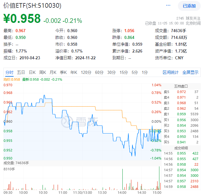 今日(11月25日),大盘延续回调态势,部分高股息风格个股盘中逆市上扬。聚焦“高股息+低估值”大盘蓝筹股的价值ETF(510030)场内价格涨幅一度达到0.73%,后震荡回落,截至收盘,小幅下跌0.21%。