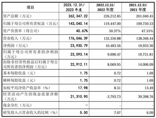 瑞立科密的归母净利润也由2021年的1.99亿元骤降50.91%至2022年的9696.47万元,2023年则再度回升143.32%至2.36亿元;2021年至2023年的扣非后净利润分别为1.40亿元、8069.95万元和2.29亿元,波动较大。
